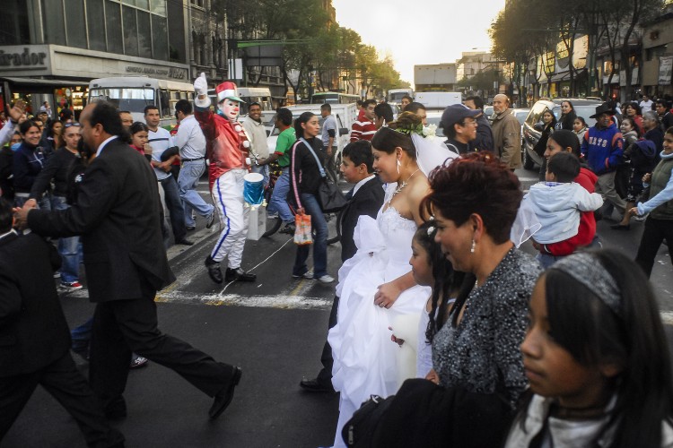 En Madero y el eje Central, en el Centro histórico, una novia y un payaso cruzan sus caminos (2010)